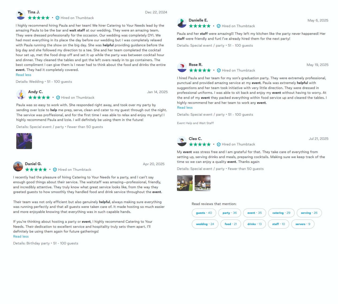 Professional wait staff for all your events. We have up to a team of 12 for your events. We have a total of 5 Licensed Bartenders and one that is an event photograher. We will plate and serve your food that is ordered from your favorite Kitchen . We will retrieve and clean your kitchen. We serve appetizers, main course, desserts. and even Champagne.